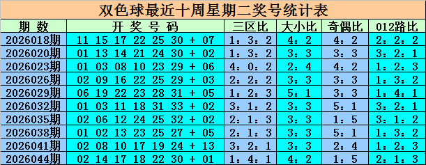 奇偶分析:上周二第26044期奇偶比为1:5,偶数红球火爆,本期看好偶数红球大热,关注奇偶比2:4。