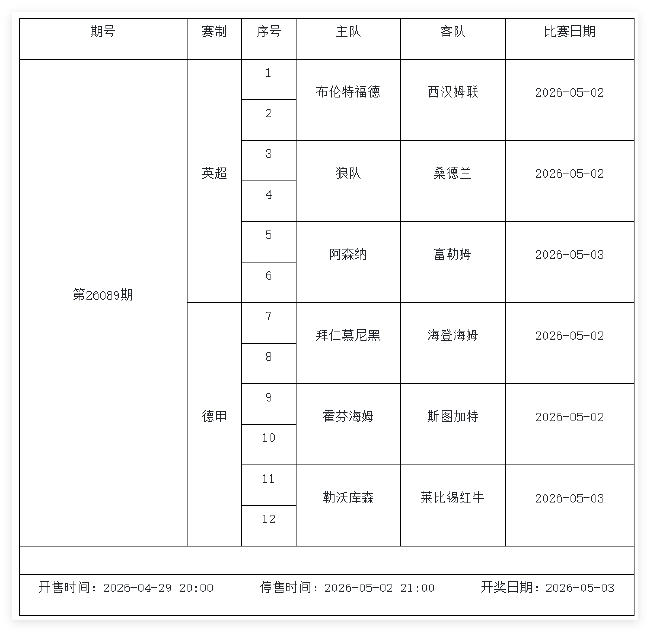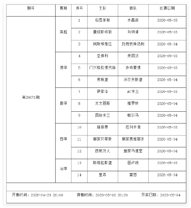 北京时间2026年4月28日亚新真人百家乐,国家体彩中心公布了2026年5月1日-5月7日的足彩赛程,5月2日(周六)、5月3日(周日)、5月5日(周二)共3期。其中第26070期由英超、德甲、意甲、西甲赛事组成;第26071期竞猜英超、意甲、西甲、德甲和法甲;第26072期竞猜欧冠、欧协联、欧罗巴、芬超和解放者杯。完整公告如下: